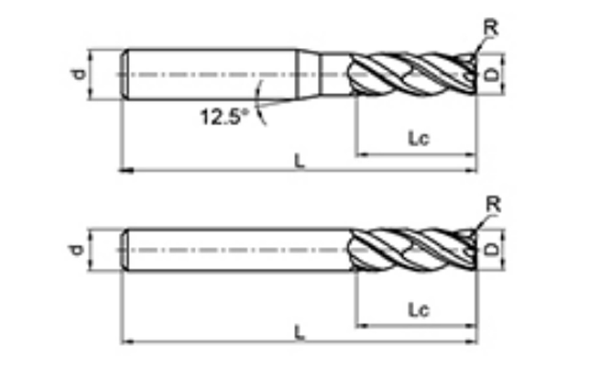 | いいえ。 | 直径 D | R角度 R | 刃長さ LC | 全長 L | シャンク径 d | 刃数 F |
