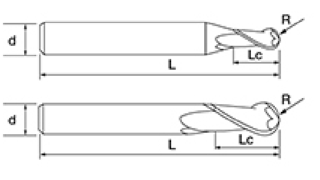 | いいえ。 | 直径 D | R角度 R | 刃長さ LC | 全長 L | シャンク径 d | 刃数 F |