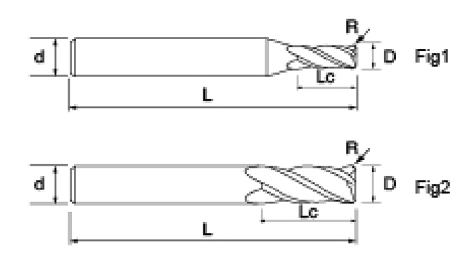| いいえ。 | 直径 D | R角度 R | 刃長さ LC | 全長 L | シャンク径 d | 刃数 F |
