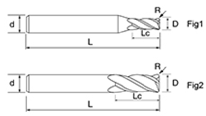 | いいえ。 | 直径 D | R角度 R | 刃長さ LC | 全長 L | シャンク径 d | 刃数 F |