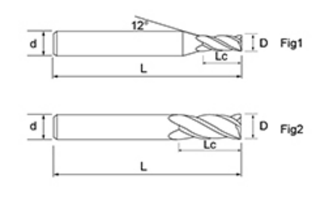 | いいえ。 | 直径 D | 刃長さ LC | 全長 L | シャンク径 d | 刃数 F |