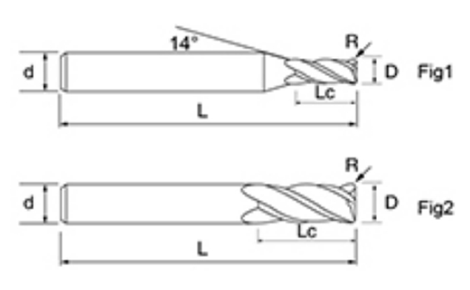 | いいえ。 | 直径 D | R角度 R | 刃長さ LC | 全長 L | シャンク径 d | 刃数 F |