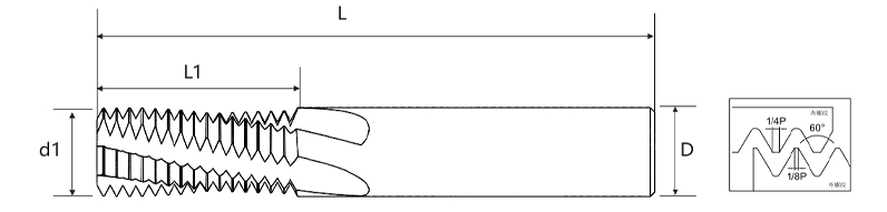 | ピッチ | 粗い歯 UNC | 細かい歯 UNF | 刃径 d1 | 有効刃長 L1 | ハンドル径 D | 全長 L | 刃数 | 底穴径 |