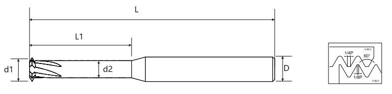 | ピッチ | 粗い歯 UNC | 細かい歯 UNF | 刃径 d1 | 回避直径 d2 | 有効刃長 L1 | ハンドル径 D | 全長 L | 刃数 | 底穴径 |