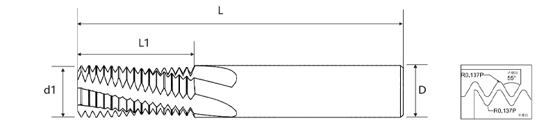| ピッチ | 仕様 | 刃径 d1 | 有効刃長 L1 | ハンドル径 D | 全長 L | 刃数 | 底穴径 |