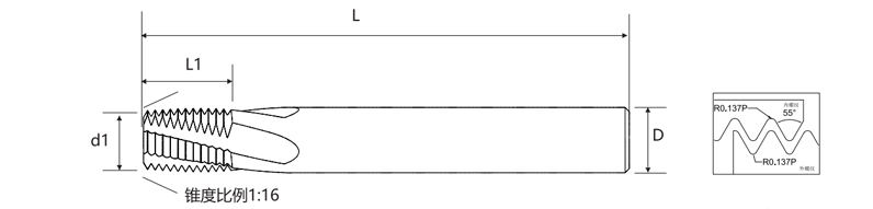 炭素鋼、合金鋼、ステンレス鋼、鋳鉄、非鉄金属、プラスチックなど、さまざまな材質に適したフライスです。 RC1/16 から 2" までの複数の仕様が用意されており、多様な用途のニーズに柔軟に対応できます。工具の設計により、切削径 d1、有効切削長 L1、シャンク径 D、全長 L などのパラメータ構成を柔軟に設定できるため、加工効率とねじの品質が最適化されます。